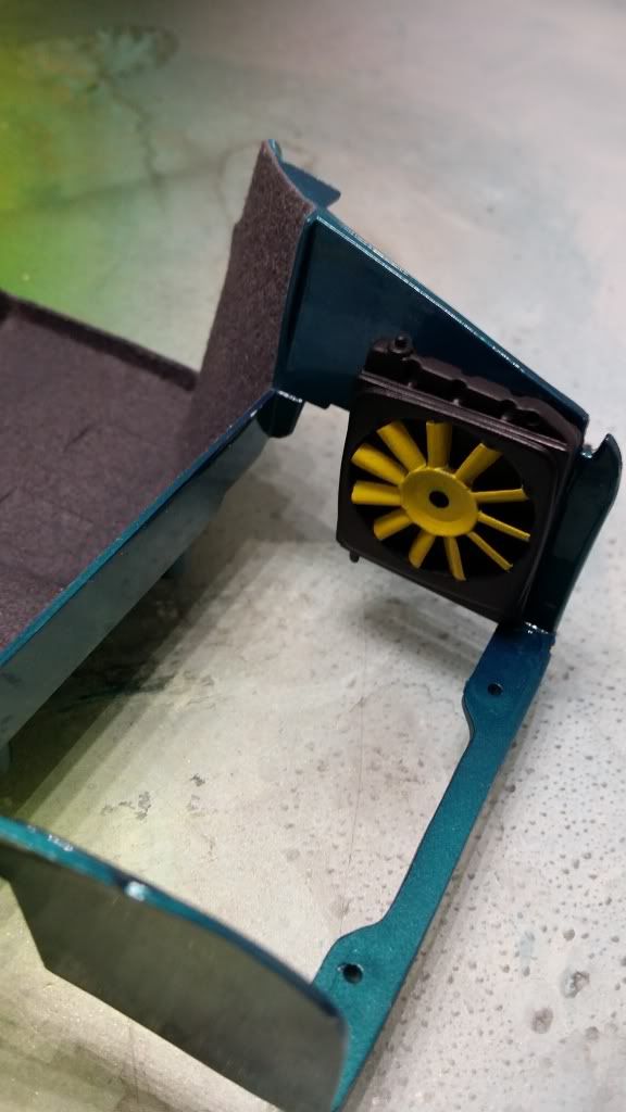 I painted the inside and the outside radiators. I'm planning to weather the engine a bit so the fans were lightly sprayed with flat black.