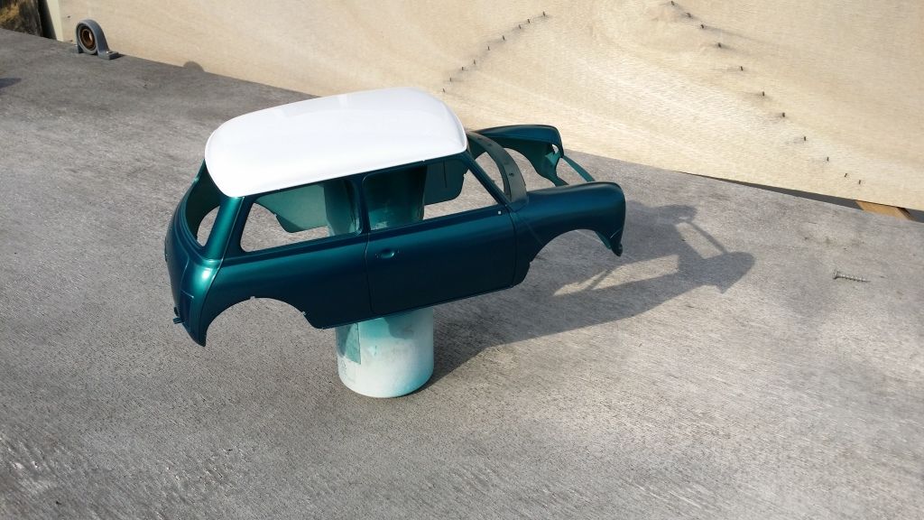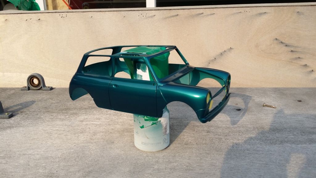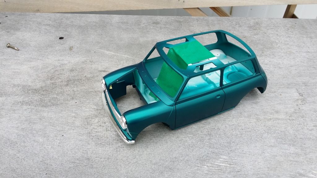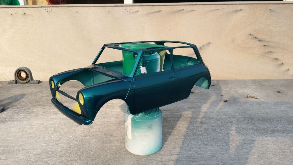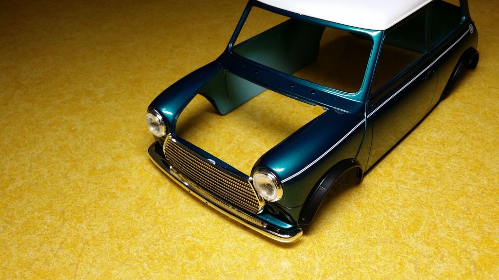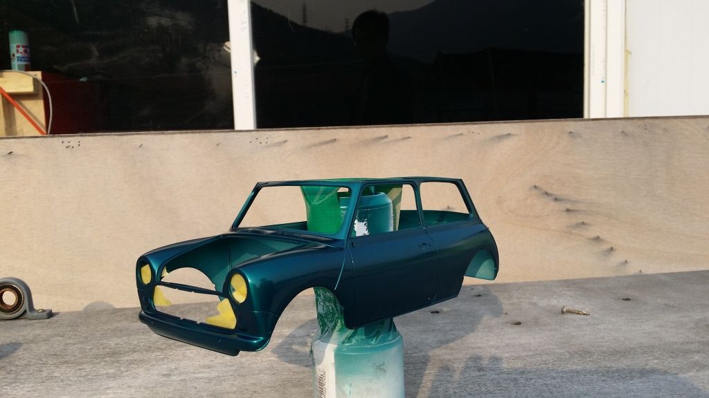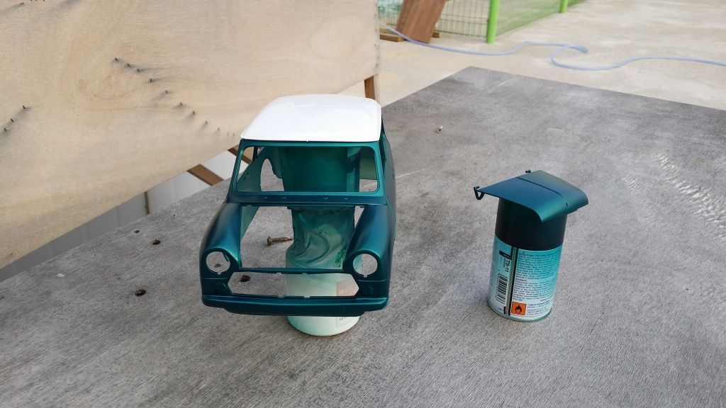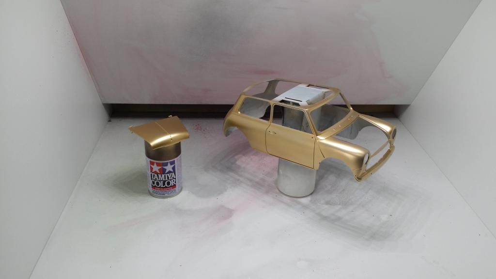 Then I gave the body a golden base and painted it with Mclaren F1's Metallic green as I thought this cool color would suit the Mini and it seems to be very close to the original metallic green that Rover was using in the 90's. It will change quite a lot after clear coat (hopefully in plus) but I'm pretty happy with the shade already.