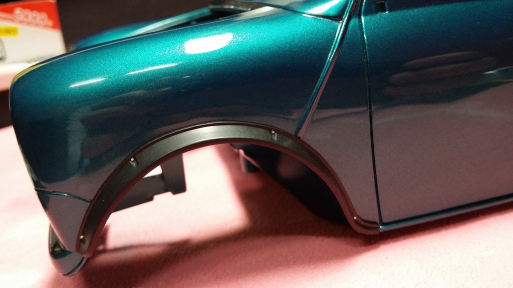 But it really started to look like a real mini when I glued the black wheel arches on (which btw don't fit very well). Since they looked a bit plain, I added little p/e rivet heads