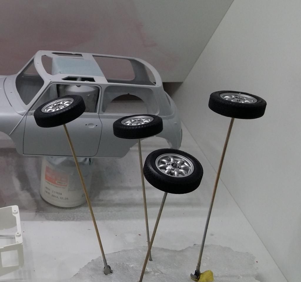 Engine is done, interior is done, wheels are on. The only major work left to to be done is the roof and clearcoating the hood + minor details like lights, bumpers, decals etc. and... I can't find the handbrake anywhere so I guess I will have to scratch build it :/