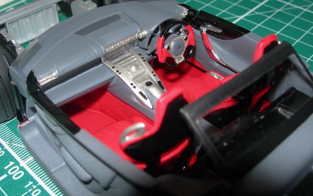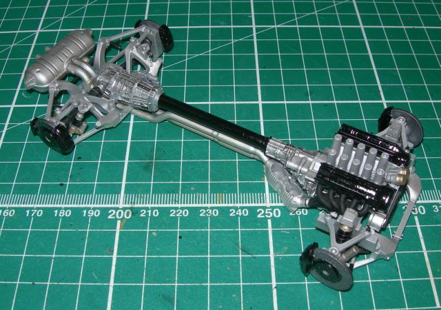 This kit represents the current “state of the art” from Tamiya and, as such, is a complete dream to build. Simple construction, simple painting, truly excellent results. I love the way the engine/propshaft/gearbox/exhaust builds up as a separate unit which is then attached to the chassis in one. The kit includes all the photo-etch one could want, and the use of tiny magnets gives display options with the bonnet (hood) and rear deployable spoiler.