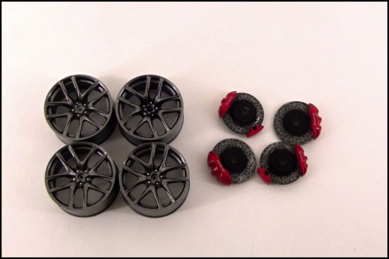 something new.. wheels in gunmetal, brakes are also finished with drybrush on rotors to look like carbon-ceramics. the photo isnīt quite good, but i like the finish. some other parts are painted, also the exhaust system. there will be some drybrush, wash on it later, because he donīt look really good.. so here are the better photos, i hope :)