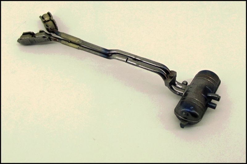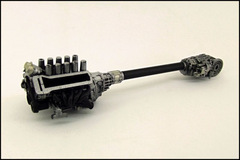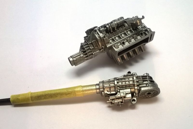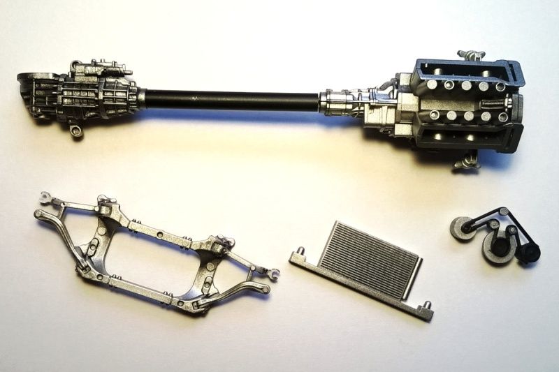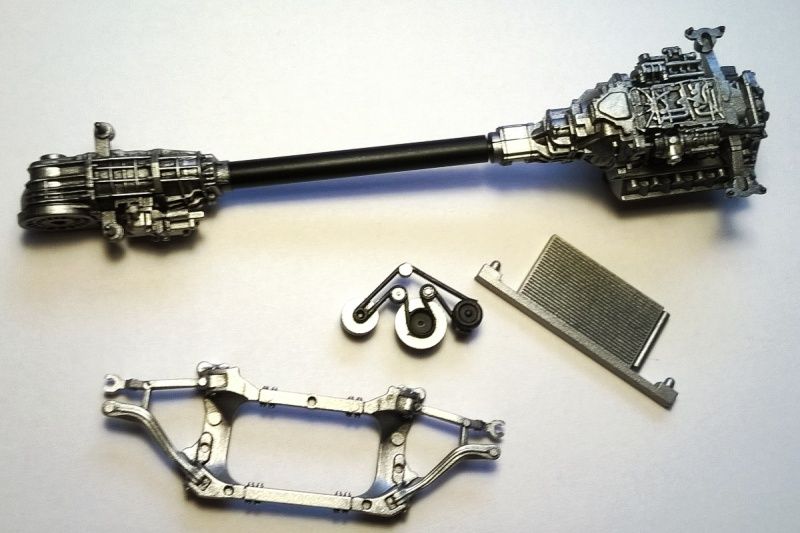 Anyway... Parts in aluminium. I used a light layer of paint on engine and differential so there are a black shades on them and it looks more realistic, iīm very satisfied with it :D also the exhaust system is in Alclad chrome. Threre will be some other colours to look better :)