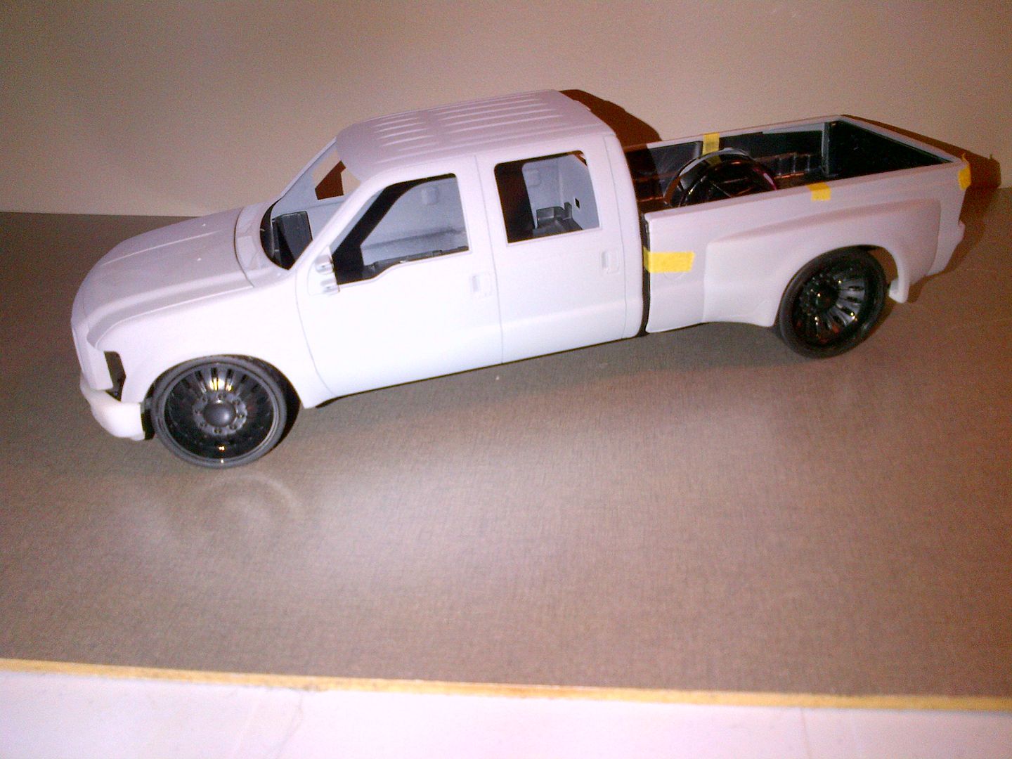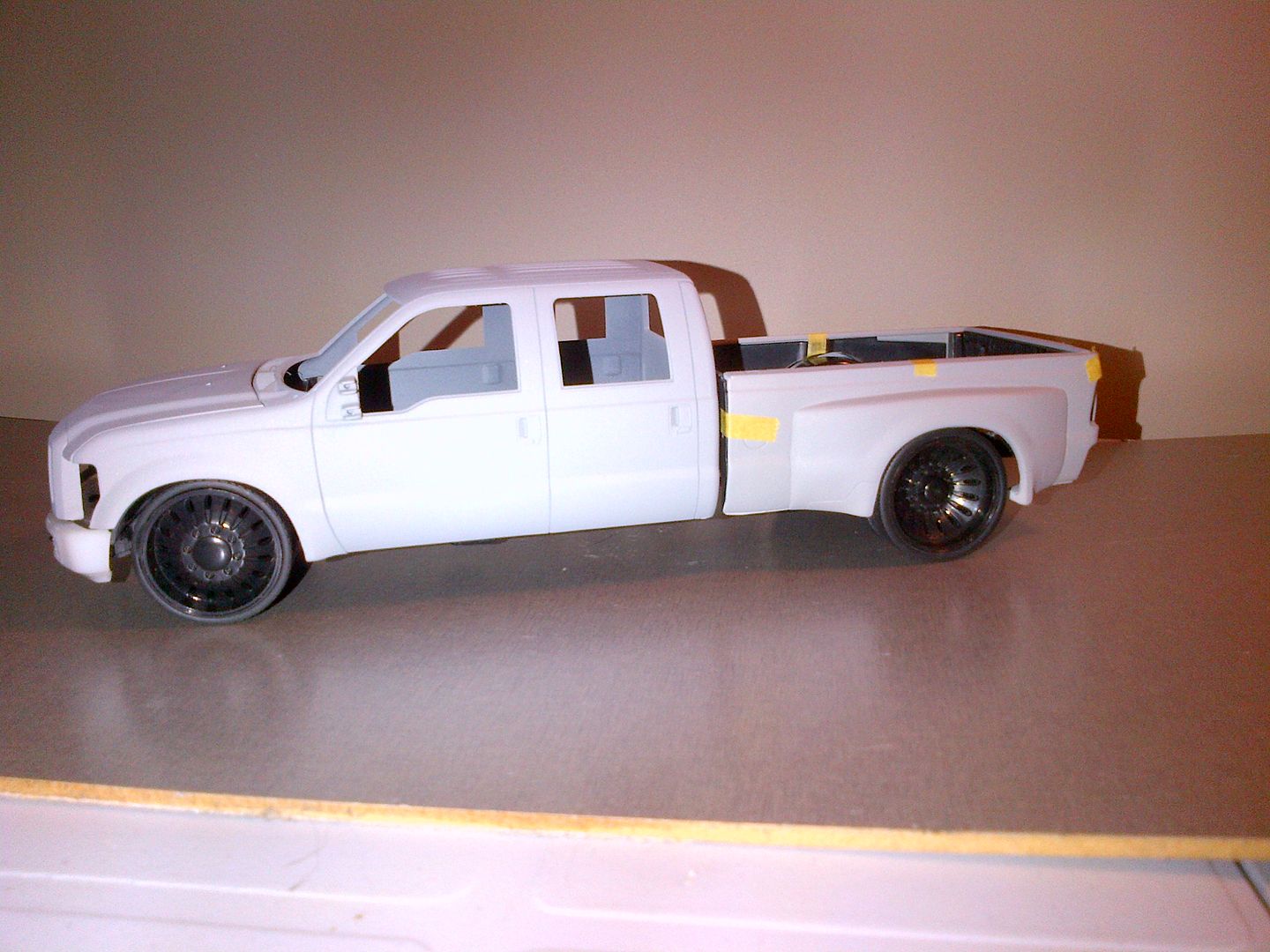 Just some quick mock ups of a project I started back at the beginning of the year. I wanted to make a dually out of it and was trying to find a source for set of box fenders from the old RM Ford F-350 dually but couldn't find any at a reasonable price, when I stumbled on http://www.scenesunltd.com/ . And, Daniel had a set of fenders in development. So, I waited, and waited and waited, and finally last weekend he emailed me to let me know that the fenders were ready. I just got them yesterday so I tossed some primer on them to do a mock up. Now the fenders are pretty much perfect, almost no flash, no pin holes or bubbles, just some light sanding on the edges and they were ready. Details.....
