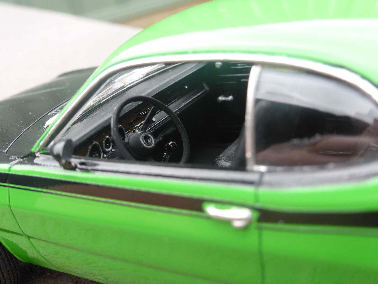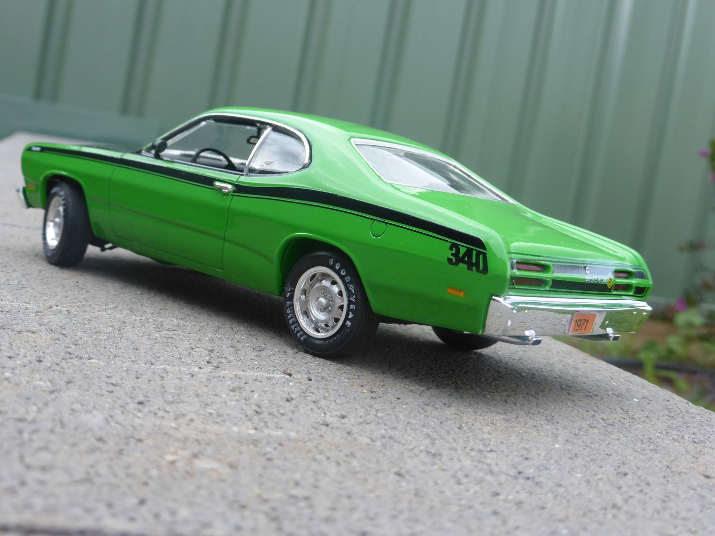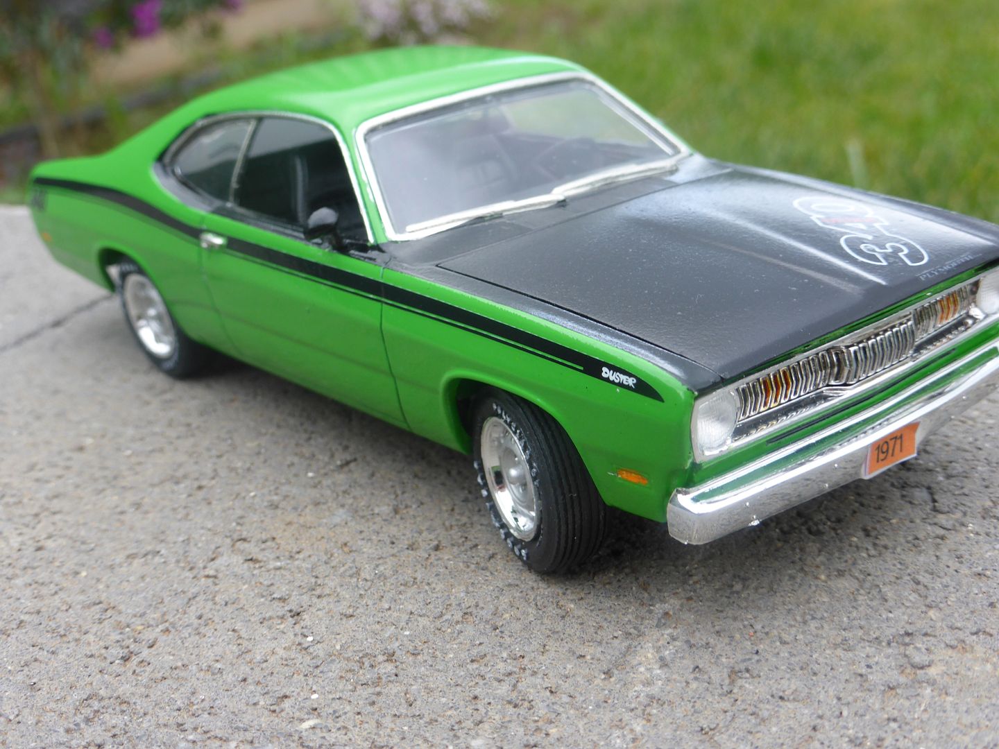 Just finished this one after stalling on it for years.... It's AMT's 1971 Plymouth Duster in 'Sassy-Grass green'. I hunted for this one because it's the car on the cover of The Cars "Heartbeat City (https://en.wikipedia.org/wiki/Heartbeat_City)" album, one of my favourite albums of all time. The cover is a reproduction of Peter Phillips 'Art-O-Matic Loop-de-loop (http://www.peterphillips.com/news/art-o-matic-loop-di-loop-1972-the-cars-%E2%80%9Cheartbeat-city%E2%80%9D-album-cover-1984/)' painting, which itself appears to be taken from a Duster brochure (http://www.allpar.com/photos/vimages/plymouth/1971/Duster.jpg) from the time.