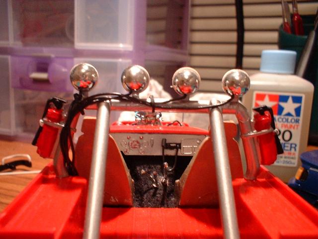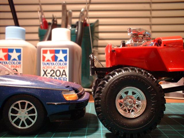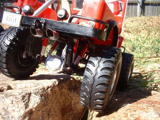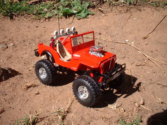 I was not real happy about building the 3 kits but i put them together and this is what i came up with, I scratch built the front bull bar, and the back one(bit shitty) I ALSO USED THE LEAF SPRINGS AND DIFF FROM THE MAD MUDDER, CUT DOWN AND SIZED UP FOR THE CHASSIS OF THE JEEP, THE WHEELS ALSO OF THE MUDDER KIT TO LIFT IT, AND I USED THE EVERGREEN PLASTIC TO SPACE THE SHACKLES HIGHER AGAIN. I WIRED THE SPOT LIGHTS, THE CB AND THE ENGINE.THE ROLL BARS ARE ALSO FROM THE MUDDER CUT DOWN TO FIT . NOT MY BEST WORK BUT ONE OF THE MOST FUN KITS IVE BUILT'.