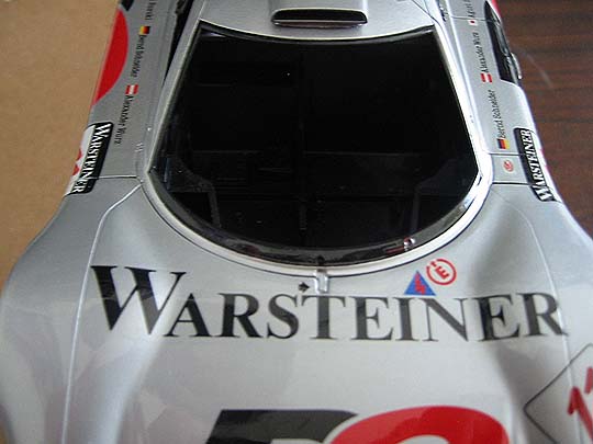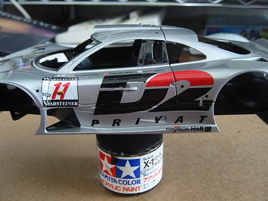 i'm not too happy with the results. i had much more agressive plans for this kit. the reason it took me so long was that i just kinda lost interest in finishing it up... i envisioned doors which opened and closed with a removable front end that had some sort of 'catch' to keep it on. it wasn't until i removed the passenger side door that i realized that the plastic was too weak to support the hinges (not to mention the door was very weak due to the shape) so i decided to scrap that idea and put the door back on only to realize i used the wrong putty and could not recreate the panel lines. the tamiya putty is brittle and would crack it you do this. you will need some sort of epoxy putty. so strike one... authenticity down the tube. when i finally got around to do the decal work... microsol all over the driver side door decal... had to airbrush the messed up part on. it looks okay but the decal folded leaving a bit of a 'lip'... strike two... when i hit the third strike, i'm going out to buy a new kit!