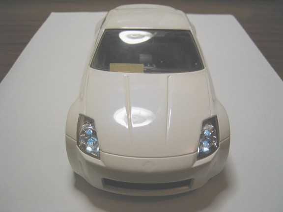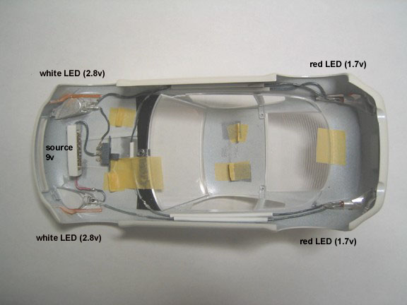 Now, if you are running two white leds with a typical operational voltage of 3.0v with a 9v souce, you would definitely need a resistor even if you put them in series (I’m not going to go into the basic circuit structure of series and parallel circuits when an internet search will do so more comprehensively). It is necessary to drop the voltage by at least 3v to keep the leds within manufacturer’s recommended operating voltages. These particular white leds use 20mA of current. Thus utilizing ohm’s law, v=I*r (where v=voltage needed to be dropped, I=current that the leds draw, and r=resistor value necessary to maintain reliable operating conditions for the led), 3v=(20mA)*r. this gives us a series resistor value of 150ohms. This is the resistor value that you would need to maintain 3.0v to each led. if you want to bump the voltage per led lower, just bump up this resistance value and vice versa if you want to bump the voltage higher (but remember, higher voltages mean shorter operational lifetimes). As it relates to illuminating lights for models, resistors are only needed in a circuit for this reason only. Nothing more. so, if your circuit is similar to the one I used for the 350z, you don’t need resistors as they fall in a desired operational voltage. If you have leds with ‘undesirable’ typical operating voltages such as 4.5v, you might need to tweek the circuit as described above to keep the leds in the operational region (depending on your source that is).