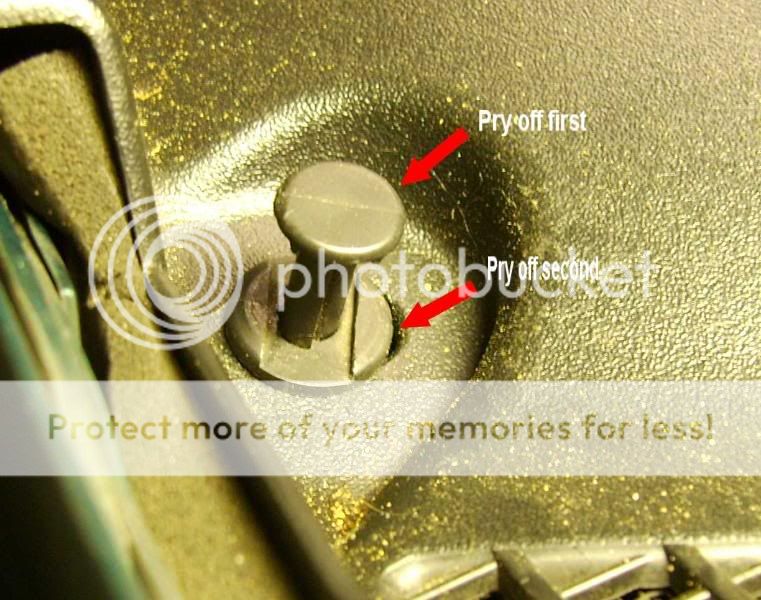 Overview of cowl with short arrows pointing to clips/screw to come out (center clip not visible). The round hold down is a plastic screw.