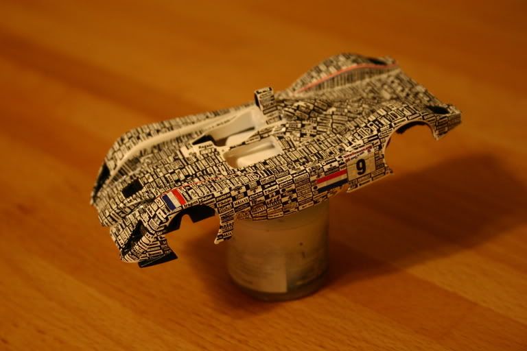 The photoetch pieces were added behind the front wheels and filled, the whole car was primed in grey primer to look for imperfections, after more filling and sanding I applied two coats of Tamiya white surface primer and wet sanded. After the body dried I applied five coats of TS-26 pure white straight from the can, hitting it with the hairdrier between coats and then rubbing out after it had dried for a couple of days.