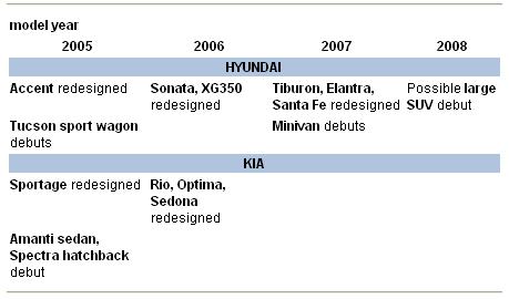Here's what Hyundai and Kia Motors Corp. are planning for the United States for the 2005-08 model years, based on company and other sources.