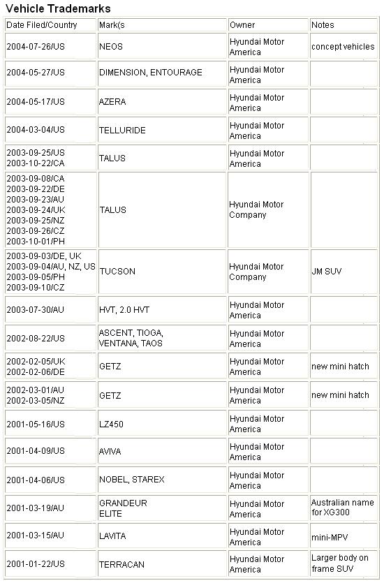 The following vehicle trademarks have been filed by Hyundai since 2001...