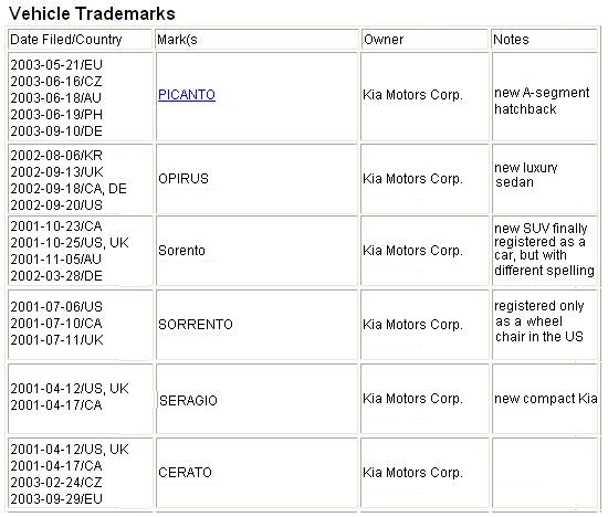 The following vehicle trademarks have been filed by Kia since 2001...