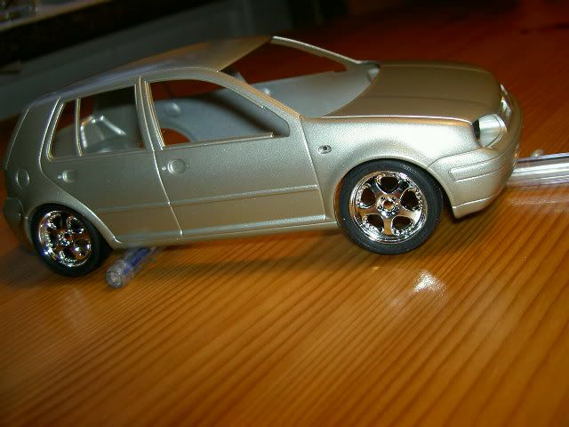 Tamiya VW Golf V6 in progress here. Its painted with the new TS 75 (champagne gold) and is seen here propped up on a couple of sets of wheels which im really undecided on. Its not been cleared or polished yet as it was only painted yesterday. Shitty indoor pics but the next ones will be better.