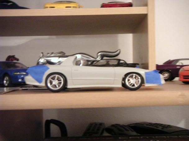 THX-The snap-fit kit has a rear panel (well, the area where the lights go) with the ridges molded in already, which will make it much easier to paint. I may do a transplant. The snap-fit also has the taillights molded in transparent red so I think I can make them look pretty good. I built a 96 Formula a while back and I remember the kit decal for the taillights looking plain stupid, and not even fitting to boot. This one will be better. Also, I didn't glue the hood down, I even think it's a little crooked in the second pic from when I turned it to take the picture! :p