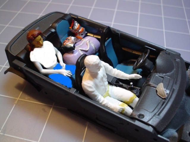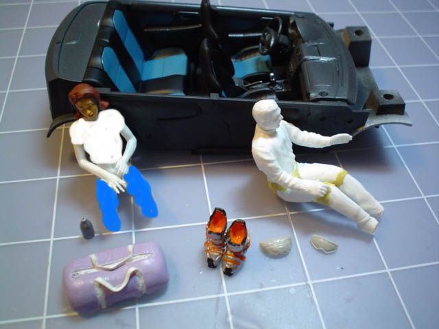 Started work on the interior details, too. The duffle is three thick peices of styrene laminated on each other, and then covered in putty to make the shape. I used a narrow screwdriver to make the place for the straps, then made the straps out of masking tape I cut to width. The ski boots are cut off one of the girls from the Hasagawa Ski People set. The goggles are from the same set, and the "bottle" is from the Tamiya Rally Mechanic set. The man for the front seat is a rally machanic that I modified to fit in the seat, cutting his knees so his legs could be straighter, and reshaping where his legs mount together and to the torso. His arm is out because he will be changing the CD in the car radio. The girl is parts from my Preiser 1:24 Eve set, using the head from the Cusco girl because I liked the hair better. She will have a Colorado State Univ. T-shirt and jeans that I will have to make of putty. I might steal legs from a rally mechanic yet to make that easier. I will definately steal shoes from one for her, poor girl ain't got no feet. How she gonna ski?!?! Then I include a pic of how about they are all gonna fit inside. The girl will be holding the bottle.