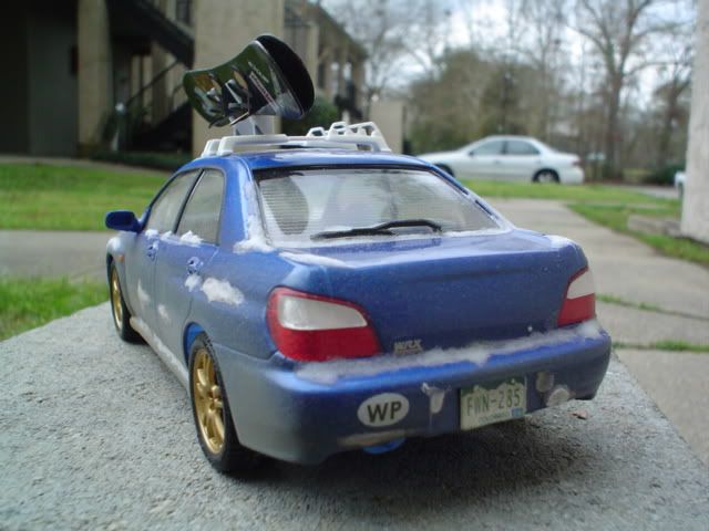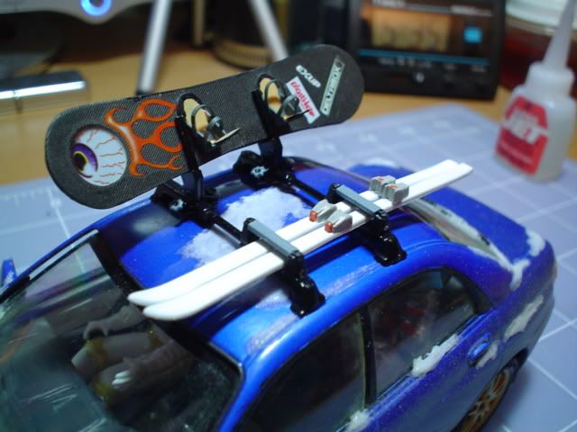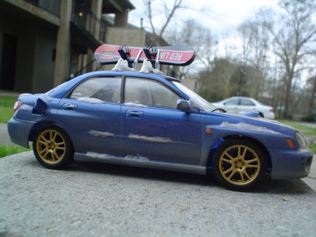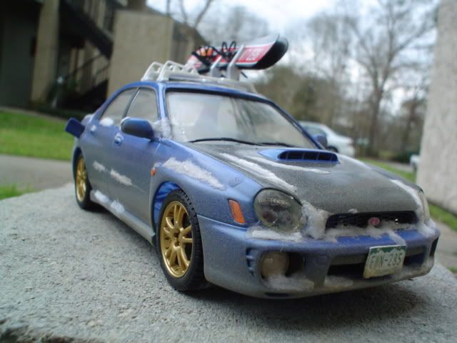 WRX = Tamiya. Ski rack, the horizontal bit at least = Aoshima S-parts Prelude. The vertical part that holds the snowboards is scratch. Winter Park decal = custom printed by a buddy. Plates = printed out on photo paper with my freakin' sweet new printer. Snowboards = scratch (check the how-to depository).