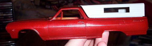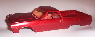 Amt 1965 El Camino reissue. Testors automotive dark met. red, same on gallardo, with clear orange overcoats.