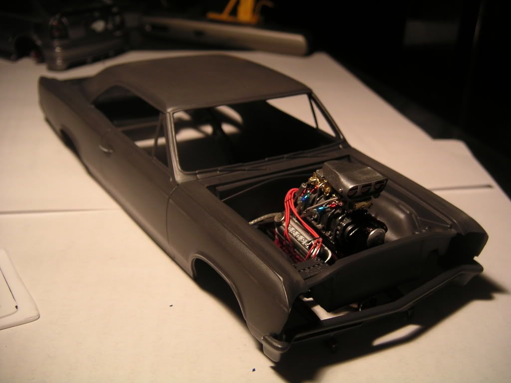 I am doing this model for a friend. I plan to plum and wire the engine. I have already made some rotors and coil over shocks for it. It will be a semi-kitbash with the '70 Superbee Pro Street. The engine shown is not the one that will be going into the car. I was just building it for practice. Here are two progress pics. The first shows it mocked up with the tires. The second is how it stands as of now. The color is Dupli-Color "Nissan Cherry Red Pearl".