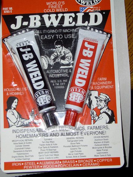 Tools and materials required: 1/2" diameter rat-tail file, or dremel drum sander, or small penknife; six-inch length of 3/4" diameter dowel rod; one sheet of 150 grit sandpaper and flat sanding block; regular (not quik-set) JB weld; carburetor cleaner; rags, latex gloves, masking tape, loctite.