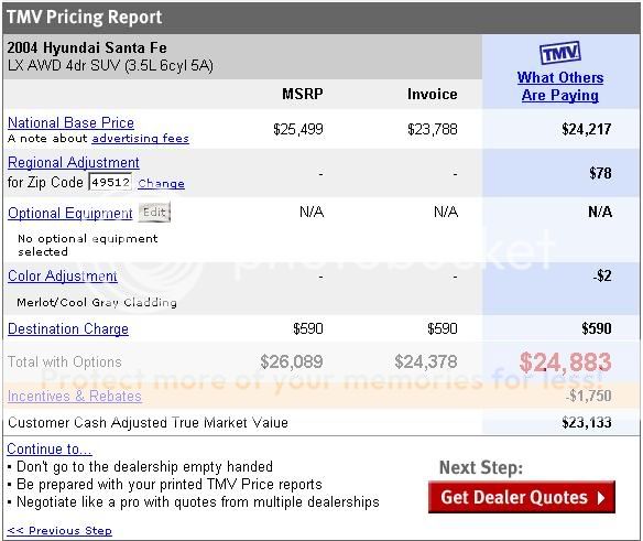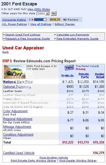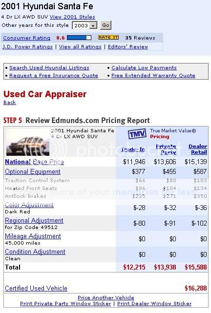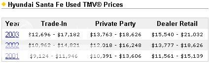 here are a couple of screenshots for example, I selected a 2001 Santa Fe LX 4WD (fully loaded) and a 2001 Ford Escape XLT 4WD (with matched options) and here are the results...