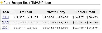 The 2001 Escpae with the matched options has slightly lower resale value across the boards and it did cost about $3000 more than the Santa Fe back in 2001. Therefore I would say anyone who bought the Santa Fe in 2001 over the Escape is ahead of the game by $3000.