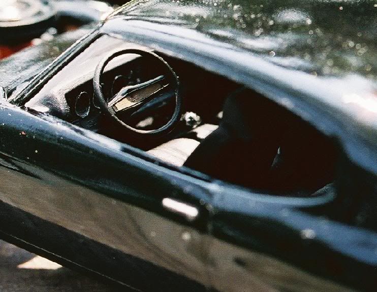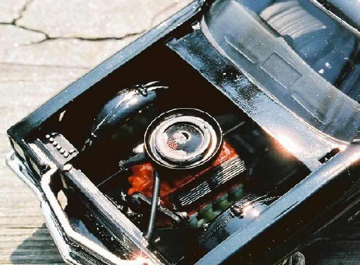 this build is pretty self explanatory. lol. an OOB build with minimal detailing. i use these OOB's to get away from the extreme scratchbuilds. i'll point out a few goofs. the front and rear stripes aren't the same distance apart. i had the rear's cleared when i did the fronts. and cleared the fronts before i noticed they were further apart than the back. as for the window trim. im not pleased. nor am i ever with my p ainted trims. i need to learn to use BMF but it isn't locally available. anyone ever used the detail master stuff? it any good? all those specks you see is dryer lint. I am modelling in my kitchen on the bar so i have a reliable internet connection (friggin wireless) and music. and the bar separates our kitchen and our laundry room. paint is one of my duplicolor jobs in universal black, with duplicolor clear coat. worked like a charm. the paint has yet to be rubbed out or waxed or anything! comments welcome