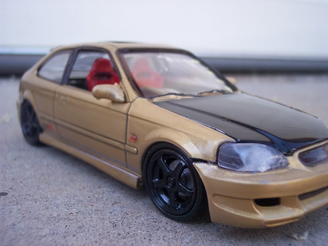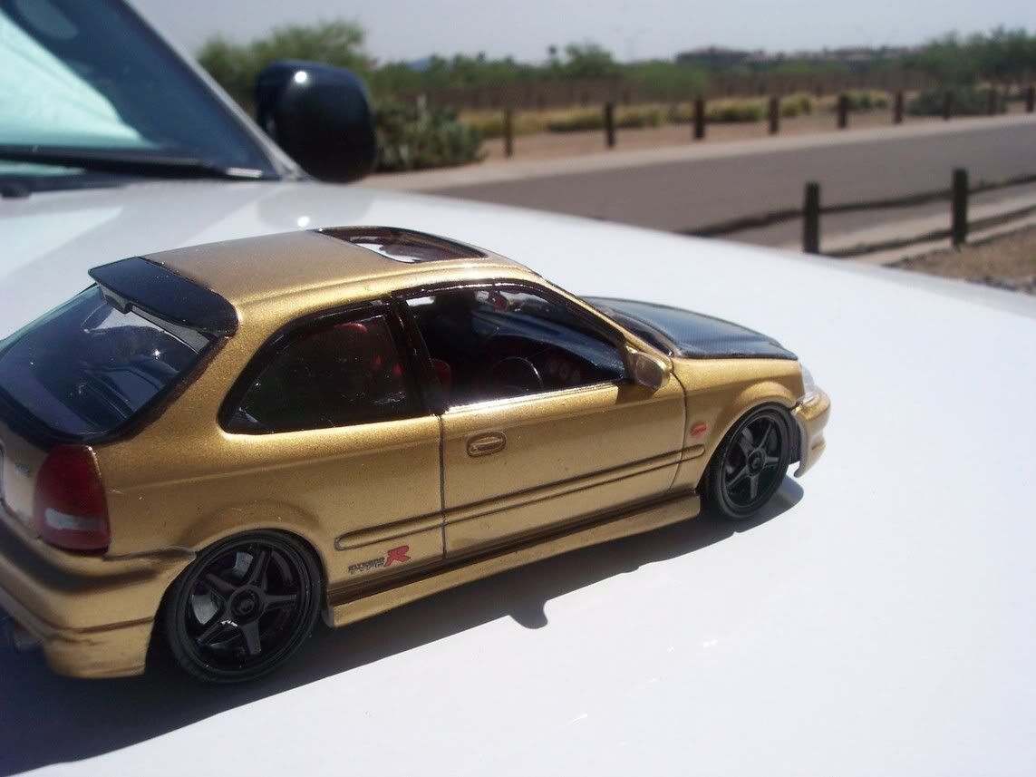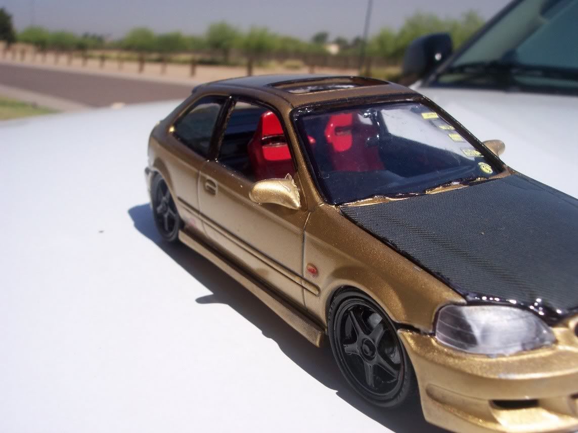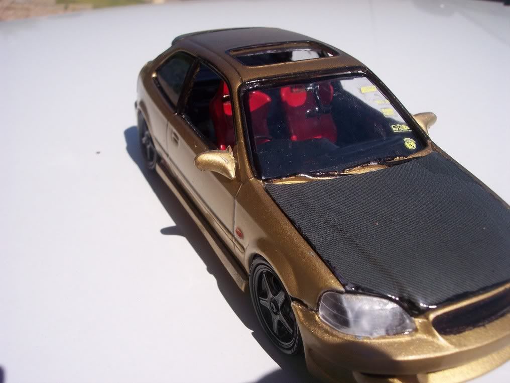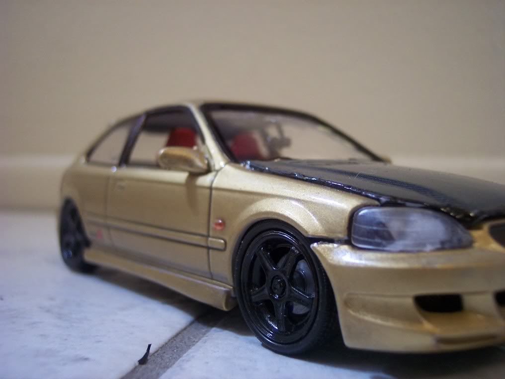 Hey all well here it is the final product i ran into a huge hill while doing this prodject, Heres the story, I had the car in my hands looking it over amazed at how clean it was while i was walking out side to paint my side skirts. Well i set the car down to the side so i could go paint my side skirts , then i realized the wind was blowing some of the spray paint towards my car, and of course theres little gold speckles all over my clear coat layers and all over my cf spoiler. Also the front got a little messer then i wanted and also gold sparkles got on my cf hood so i haft to use a black one for now until i get more cf decals. Hopefully i mananged to recover it enough to keep its name as one of my best built models but not my best :disappoin . Anyways the kit is Revell Civic Hb kit, i turned this Hatchback into a type r Civic Hatchback. Also heres the link to my progress of the build. http://www.automotiveforums.com/vbulletin/showthread.php?t=423480