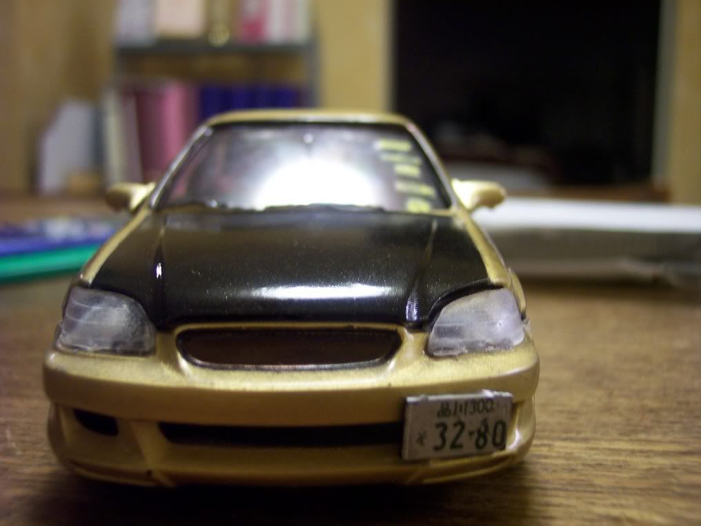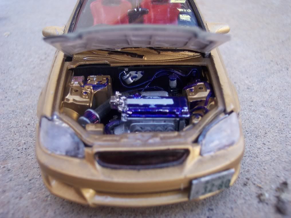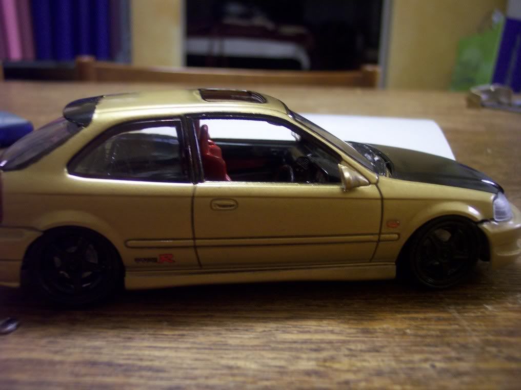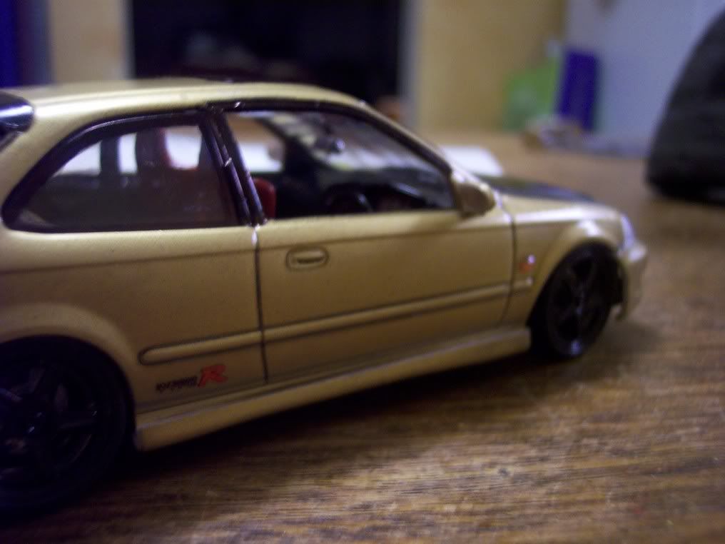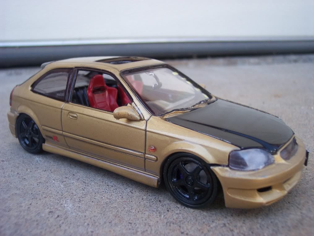 Hey all well here it is the final product i ran into a huge hill while doing this prodject, Heres the story, I had the car in my hands looking it over amazed at how clean it was while i was walking out side to paint my side skirts. Well i set the car down to the side so i could go paint my side skirts , then i realized the wind was blowing some of the spray paint towards my car, and of course theres little gold speckles all over my clear coat layers and all over my cf spoiler. Also the front got a little messer then i wanted and also gold sparkles got on my cf hood so i haft to use a black one for now until i get more cf decals. Hopefully i mananged to recover it enough to keep its name as one of my best built models but not my best :disappoin . Anyways the kit is Revell Civic Hb kit, i turned this Hatchback into a type r Civic Hatchback. Also heres the link to my progress of the build. http://www.automotiveforums.com/vbulletin/showthread.php?t=423480