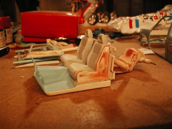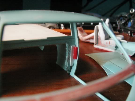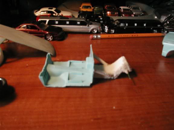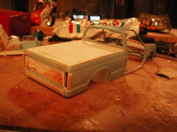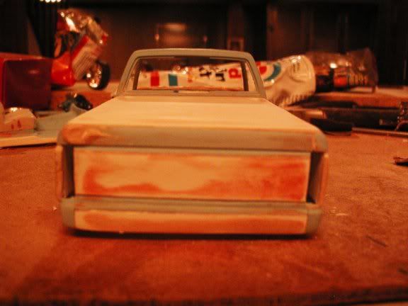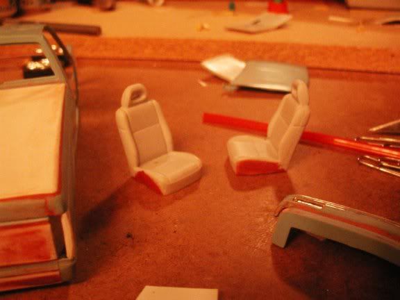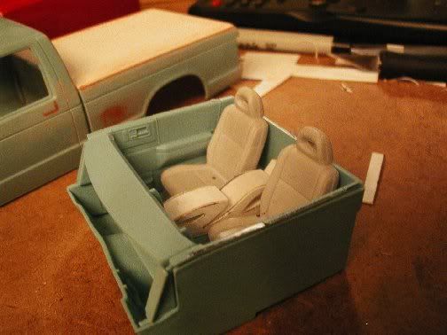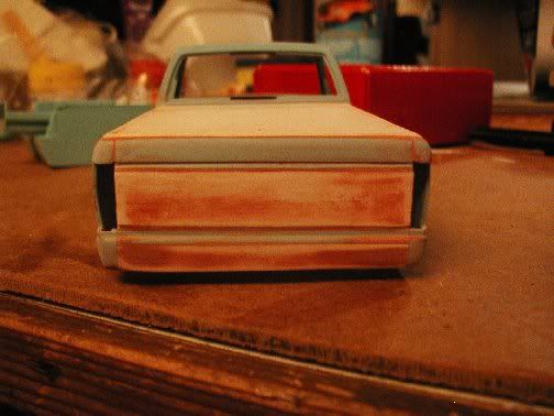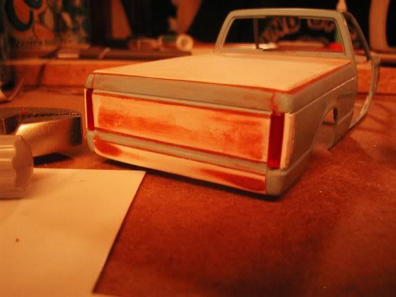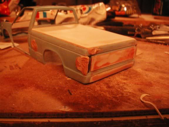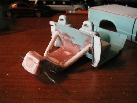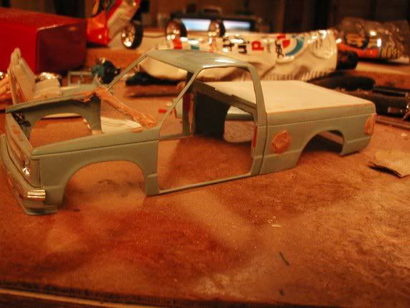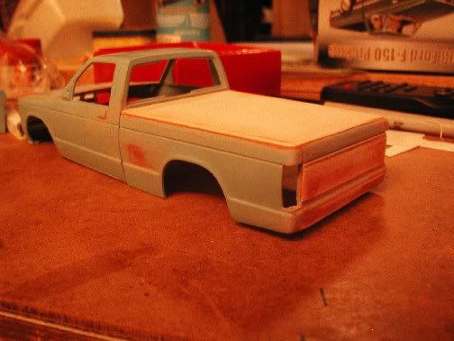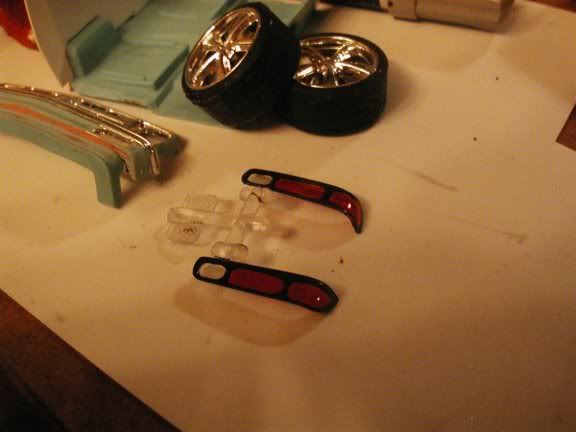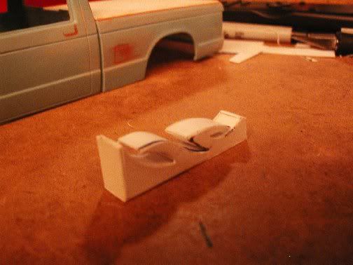 got a full day of work done on this today. Got the backwall remade, made some risers for the hinge mounts (not shown), Sanded down the melted platic on the frame and puttied over it, ready for final sand, fine tuned the rear wheel placement, assembled the steering wheel from model car garage (great parts, high quality, and the photoetched parts are easily removed with a knife), made some caddy style taillights (planning on doing a housing for them, finished the front end, awaiting new grill, started on some door panels, smoothed out dash, added some final touches to the seats to get the seat to fit. I also painted teh taillights for my yellow integra project (some of you might remember it) I tested the tamiya clear paints with these taillights, and I must say I am very impressed with the final outcome (pics dont do it justice :() to get back on topic, I designed and fitted a side graphic to further the mini truck look. I think this truck is going to look awsome with these graphics. Well here are the pics enjoy it :sunglasse