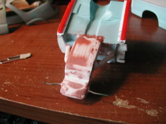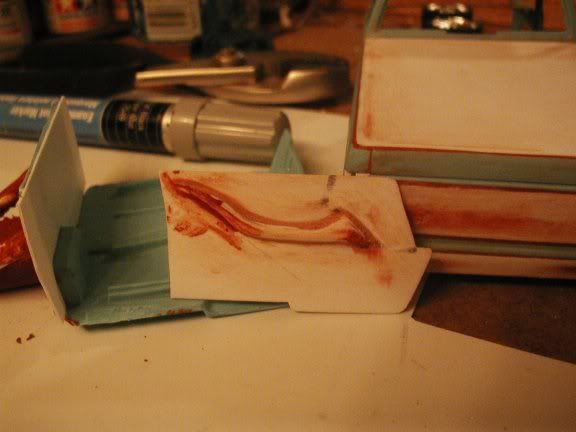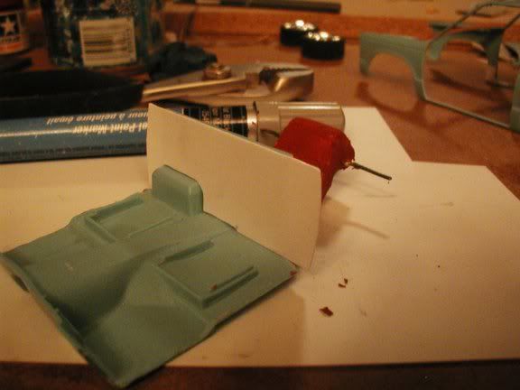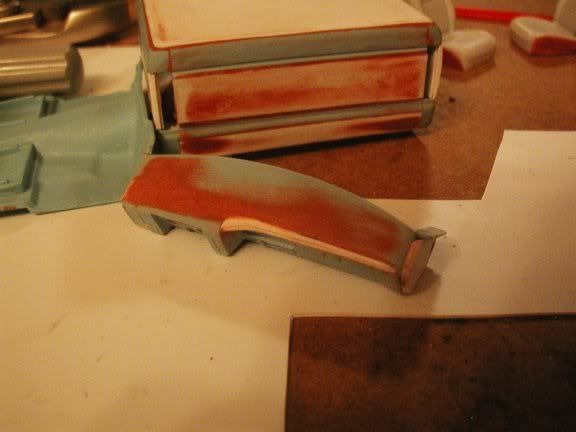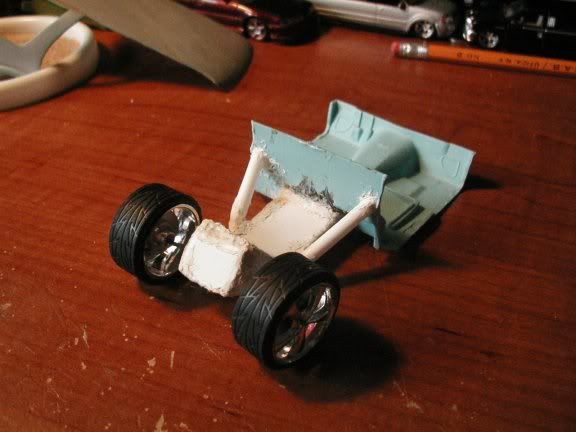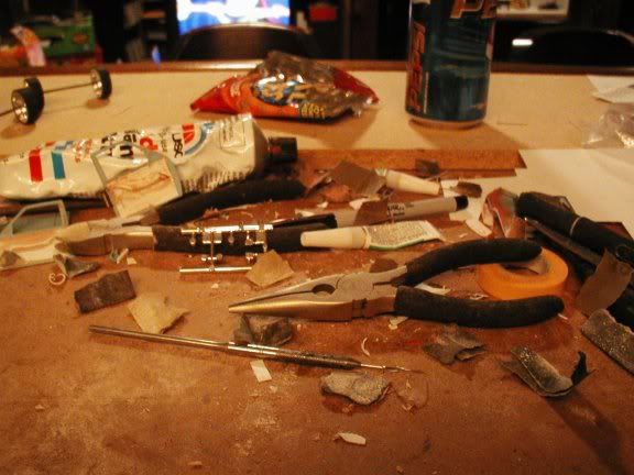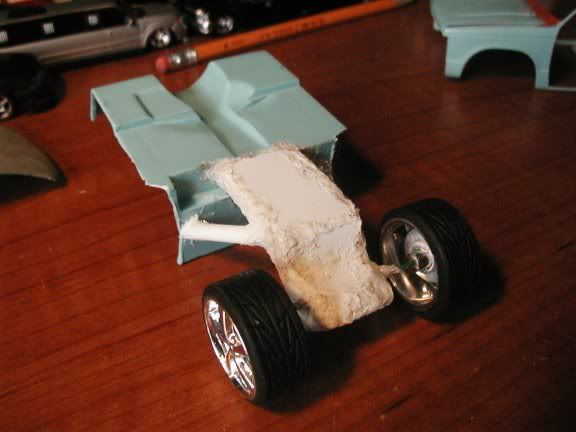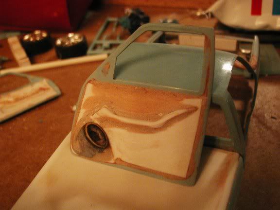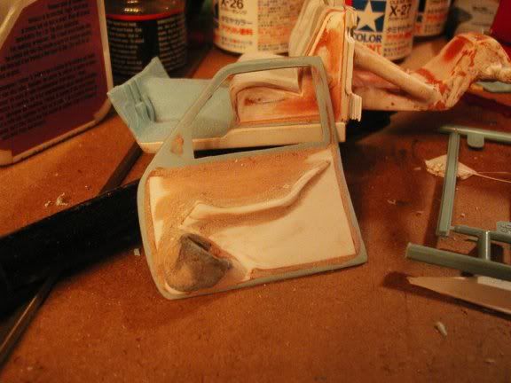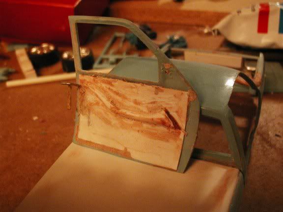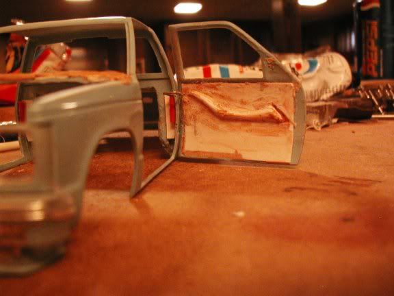 Well last night bagged n dragged help me bondo up my door panels and all bodyowrk that needed to be done, and we had to mix up 3 batches, we worked too slow :lol: I decided to clean out all of the spot putty and use a 2 part so nothing shrinks. I used bondo body filler so it wont shrink like the spot putty does. I got one door smoothed out, but i stripped the other one because there wasn't enough bondo to shape it the way I was hoping to. Got the right taillight housing shaped and smoothed. Left one is still in progress. i got the sides of the interior closed off so when the door opens you wont see a big hole, hopefully making it look cleaner. I also modified the hinge a little by adding a peice of tape around the paperclip to have a tighterfit in the tube. By doing this i can have the door off the ground when it is open, which is good :sunglasse After i finsih smoothing out the doors, the wiper cowl, and the other taillight housing i will go over it with spot puttty to remove any pin holes or grooves possibly left from previous sanding. After all of that is done im going to finally start teh front of the frame, as now i have a motor donated to me by kykustoms whos prolly lighting up a bowl :smokin: :lol: Well here are the pics for the few that are following this thread :disappoin