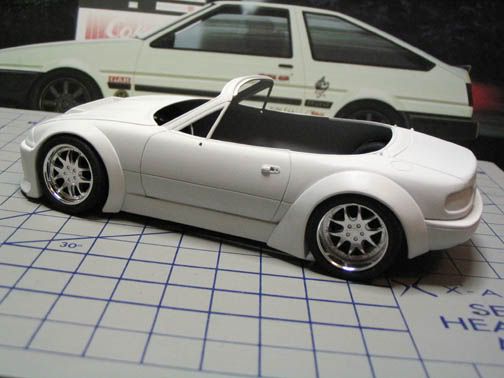 Its been a while since I picked up a kit due to work and such. But I finally found some time in the past month or two to start on what I considered a neglected kit... the Tamiya Miata. I saw something like this on the street once and I thought... pretty damn cool!! So here's my version of it by memory. I wanted a bolt on look for the flares. It was a bit tedious to go back and forth with the putty to get them rounded to the shape I wanted. So far I think I finally won the battle between me and the putty on those flares :icon16: