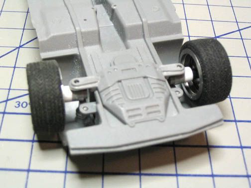 I got a chance to take some pictures of the finished suspension and the body in white primer (final ride height). In the second pic, instead of cutting the arms, I just added some plastic card to the right height to make up for the difference. Much simpler and easier than cutting the arms off and reattaching them. In the third pic, you can see that i put in quite a bit of plasitc on the front end to make up for the offset. The rest was the same as that of the website Honoturtle provided to me. Thanks Honoturtle!