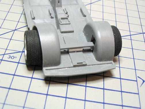 I'm actually a bit impressed with this kit as there are a crapload of accessories including a front spoiler (that I used on here as well). Since I was in the plastic-chopping mood, I decided to play around with the wheel wells and fenders a bit. After the second round of putty work, I'm fairly satisfied with the outcome. I have the rear flares and skirts to do next.