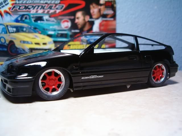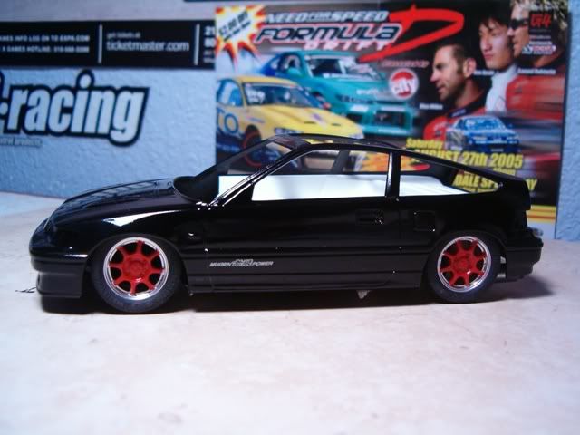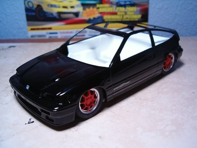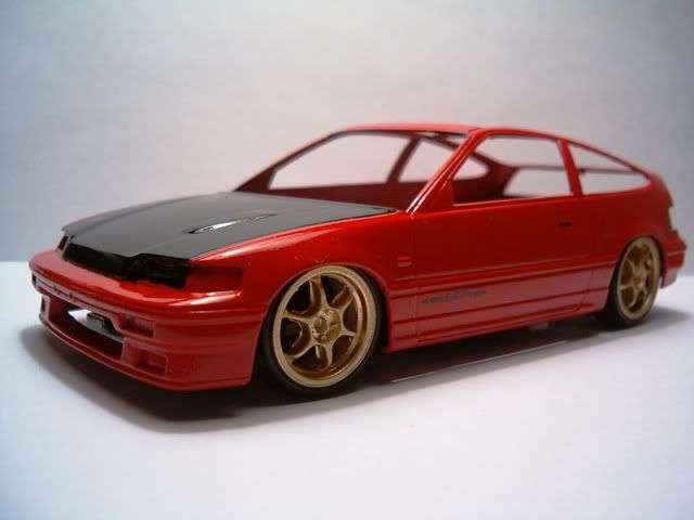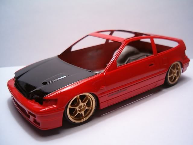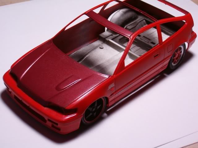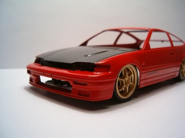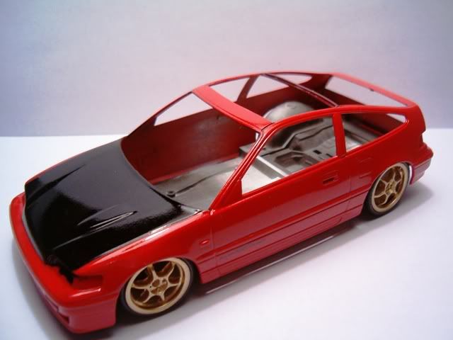 I still need to paint the panel lines semi gloss black, and paint the bottom part of the CRX semi-gloss black also. In these pics I added a black hood to simulate CF. Im too cheap to buy the real stuff :roll: