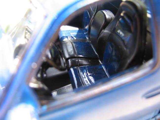 i ended up stripping it once, and then painting it again. i will warn you all, again, Duplicolors Metalcast line of paints are very hard to apply, but look great when finished. the color is the Duplicolor Metalcast anodized blue over silver, and then gray primer on the way bottom. it has quite a few coats. i lost one of the window wipers(or at least 1/2 of it) while i was stripping it, i think. all the other stuff is either Duplicolor flat black or some type of Testors brush paint. in case you didn't notice i left a couple of engine parts out, either cuz i didn't feel like putting them in or i forgot.