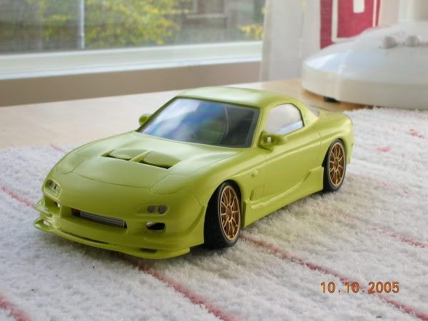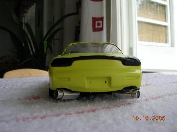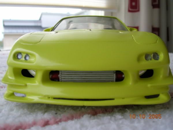 Nice job and a very cool color. Paint looks good. A few more body details like painting the side markers and some panel lines would really enhance the realism. ooh, and check the camber on the front wheel in the first pic! :) Good job!