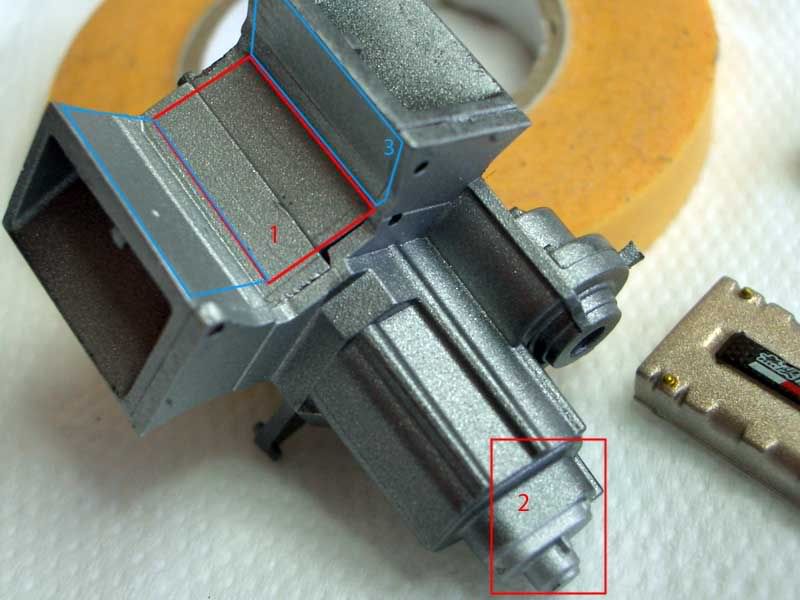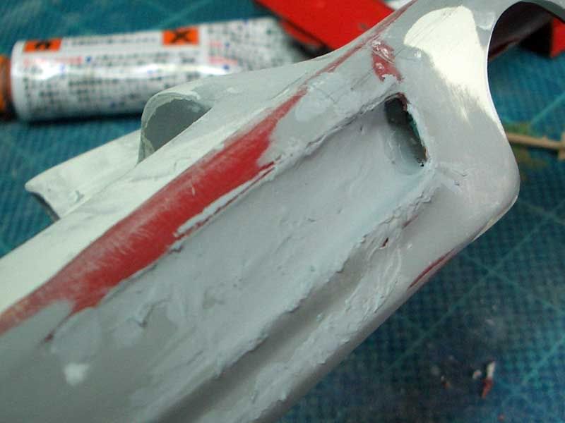 Then I made the snorkel armour with plasticard shapes, glued by 2-part glue.I also havy reinforced the inner body junction (basic nsx body and new 1 seater bonnet) with 2 part glue in order to avoid putty cracks