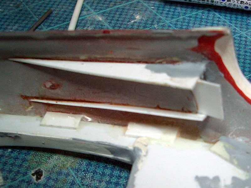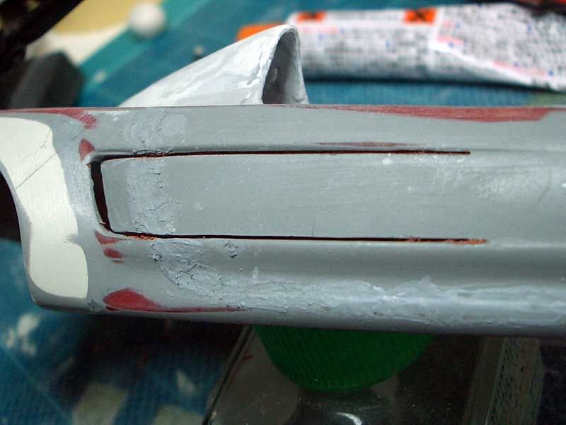 and now my beast need to breath better, snorkel may not be suff., so I plan to enlarge side's intakes: i cutted original, bond vertical surfaces and add horizontal plastic shapes, then I fill with putty