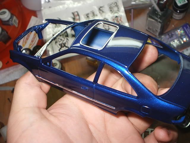 somthing else im working on, i wanted it to look classy and still have power under the hood. so for the color i went with a dark pearl blue nail polish and finished it off with urathane clear. then i started foiling the trim on the side of the car, the sunroof trim. and all the honda badges. i will leave the window trim black. and maybe a mix of tan and chrome in the interior, i swaped in a k20 out of the revell rsx. i only got one pic for now, more to come.