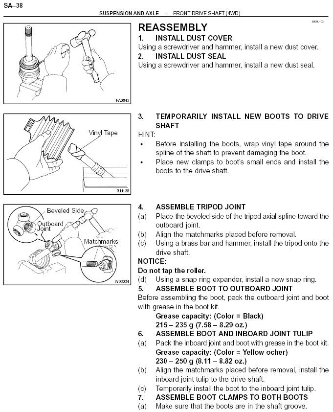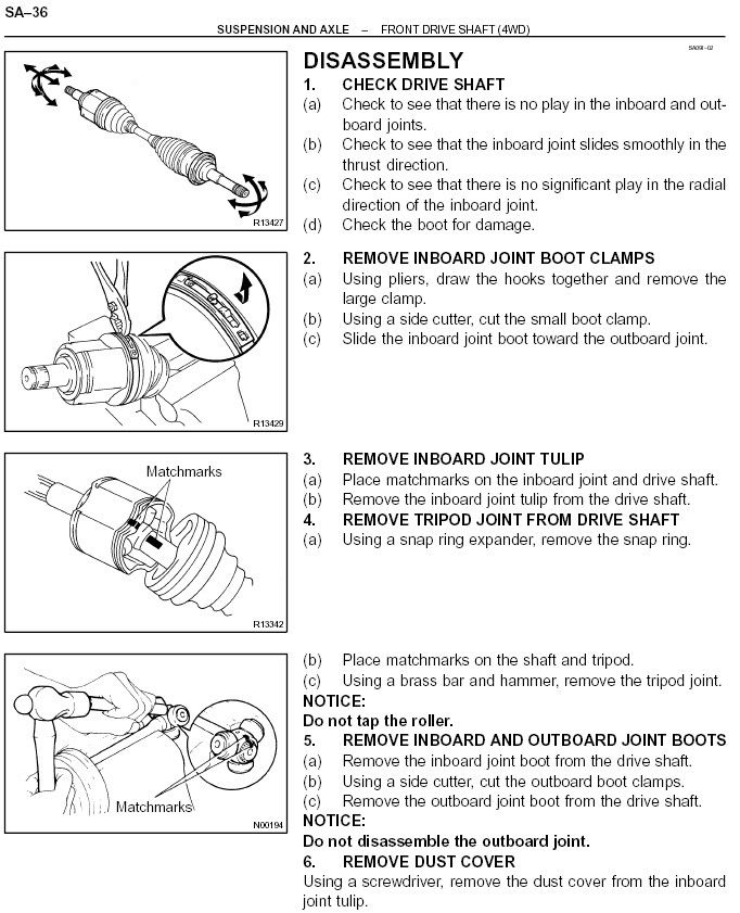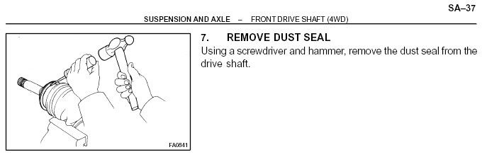 Good day Brian. No luck in getting the site to open either. I am looking for how to get the RH outer CV joint off the axle on an 03' for boot replacement. Seems like the type the you just tap off over the clip ring, but I've done a fair bit of "tapping" with no joy. Also thought it may be like a GM in which you drive the cage back out & start taking the balls out, but no luck that way either. I'm new to the Toyota section here & I will prowse this forum for some info as well. Txs
