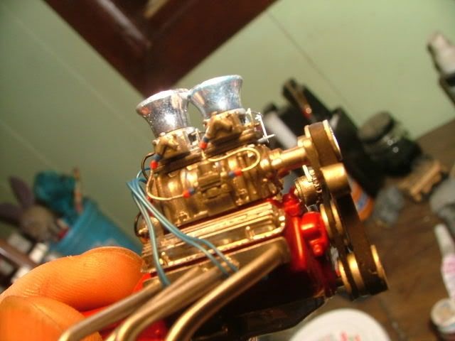 hello everyone again. well after countless hours refining kit parts, digging thru the scrap box, scratchbuilding and crawling around the floor looking for parts that vanished from my tweezers, i finally have an engine. i will keep the headers afterall and locate the battery to the firewall somewhere. i wanted it in the trunk but there wasnt enuff room.