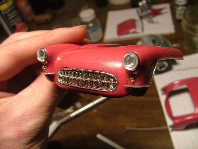 thanks again for the comments, just a small update here. i wanted to install the trunklid but the hinges hit the tops of the wheel tubs so i had to do a little surgery on them and do some touch up painting. i seem to be doing this process alot on this project, lol. here is the grill installed, i ground out the back with my dremel to open it up. the lens were unusuable so i scavenged some from my parts box and made bulbs with some stretched clear sprue. the white glue i used to attach these isnt dry yet.