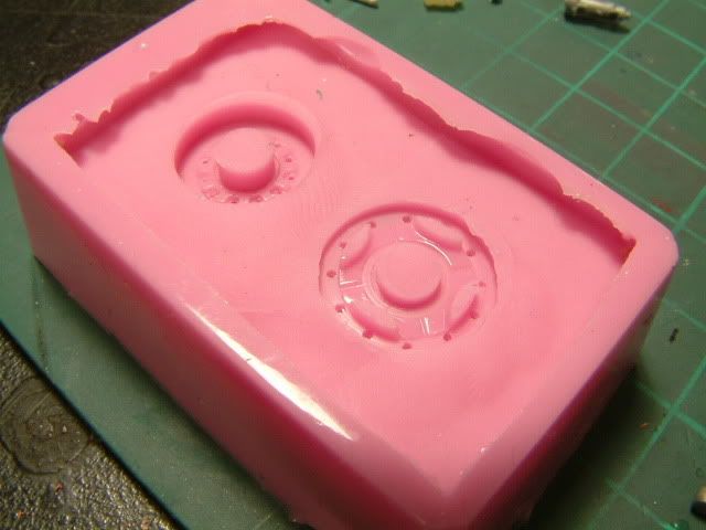 First up, if I am going to make two sets of wheels I need to make the wheel centres as well. I turned the Tamiya wheels down so they will just slip into the machined wheels. Then I replaced all the molded on nuts with Sakatsu items. I then made a rubber mold of both the front and rear wheel centres. These wheels will be designed to fit neatly onto the hub and have working wheel nuts like my other kit.