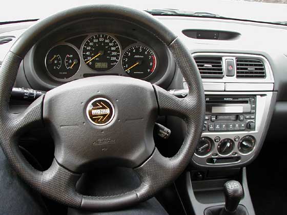 The WRX is about the same size as the Mazda Protégé which means that rear seat room is pretty tight, but the trunk is voluminous and the front seat area offers plenty of room in all directions. The WRX's seats, however, were way too small for yours truly but smaller testers raved about their prominent strong bolsters. At least they are multi-adjustable, as is the steering wheel. Speaking of which, the proudly emblazoned MOMO wheel is gorgeous and ads that much more flair to a pretty funky package. The rest of the dash design seems a bit overdone but certainly in line with the wild exterior.