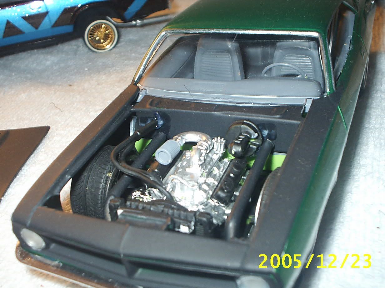 well its done but i must say this is the worst kit i have ever put together, nothing and i mean nothing fit together. the frame liiks to be for a 1/25th scale car when the body is 1/24th scale. in the motor pitcure you will see an ugly glue mark thats hot glue because i ran out fo glue at the last moment and did not want this model on my desk a second longer so i jacked the girls glue gun and got er done. the windows did not fit at all, it seems there too big. the hood dont fit. but ohh well its done and looks decent, needs touch up painting under the hood though.