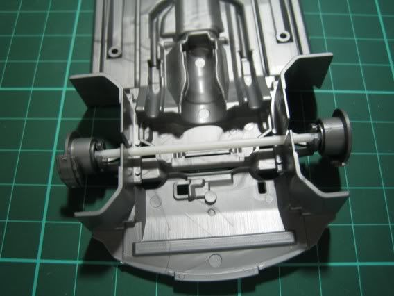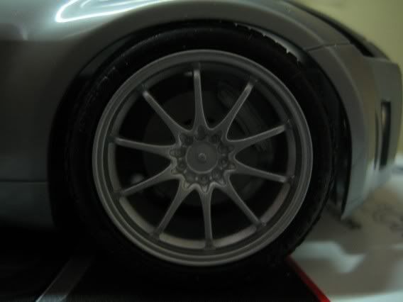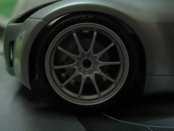 the stock rim had a very "fake" look to it. So i decided to change it to 19" CE28N. will spray it gold. one problem is that the wheels are sticking out of the car's body. so i used plastic rod to substitute the metal axle to make it easier for me to shave the length so that the wheels will be "tucked inside" the wheel arch. will spray the plastic rod black. bodyshell is cheryl's.