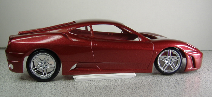 The front tires are a bit small in my opinion, but they are a carry over from the Modena. Molding is nice, in scale, and if I tweak it like the Revell Enzo I did, I think it will be another winner.... Here it is below bathed in Cobra colors "Rossa Fiorano". With the ever growing palette of colors Leon offers in his paints, you can bet it will be a long time till you see a Rossa Corsa signature ferrari red build from me!!!! It still needs to be polished which will be done in a day or 2 after the 2 part Omni dries......you should see this body in the sun!!:naughty: