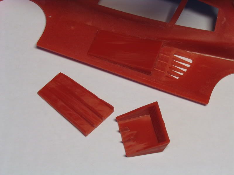 Side strakes ... my least favourite part in any kit of a car that has them. Various manufacturers suggest different solutions for this area (my favourite - Italeri on their 348). Rosso's solution is OK, but if built oob it would leave a panel line where it doesn't need to be. I tried to correct that by cutting the part that goes behind the door along the door line...