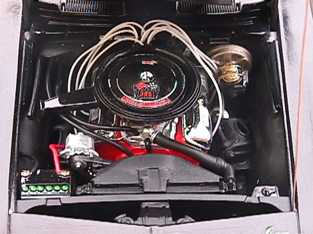 This is a milestone build for me, I'll be sorta sad to part with it, as it's the first time I've done wiring (Except 4 plug wires on a Civic), the second time I've clear coated, and the first time polishing. This build aslo gave me fits, because stuff just went wrong! The finish ended up being smooth, but not shiny, because I think I sanded and polished through the 3 coats of clear. Stuff fell off daily, becuase none of my glue seemed to bond correctly. I got superglue on the windshield, ended up polishing it off, the fuzzy dice took 5+ attempts before it stayed in one piece, the engine would not fit with the headers on (so I left 'em off :frown: :shakehead ), and I lost the rear struts and the engine bay braces. But even with all this, I think it turned out pretty nice. Sorry about the poor quality pics...